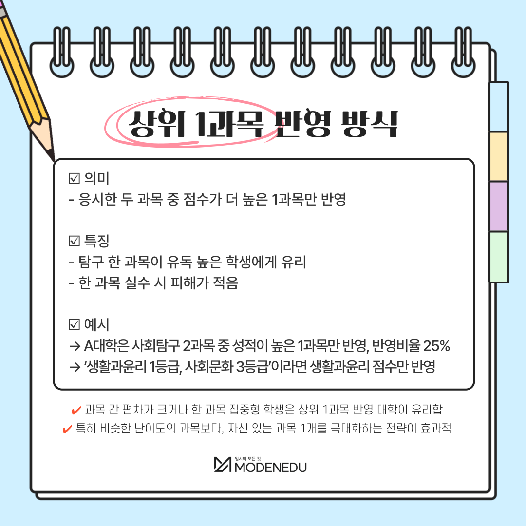 “상위 1과목 반영”과 “2과목 평균 반영”의 차이를 정리해드립니다.