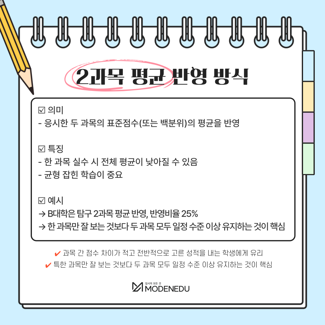 의미: 응시한 두 과목의 표준점수(또는 백분위)의 평균을 반영