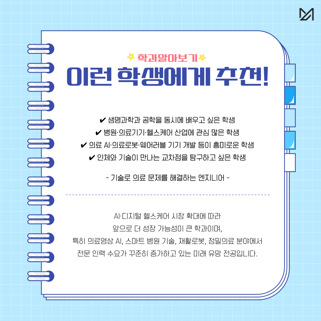 “기술로 의료 문제를 해결하는 엔지니어”를 양성하는 전공입니다.