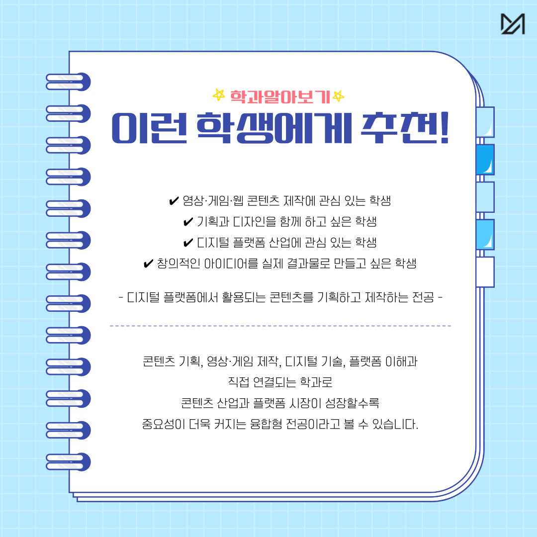 “디지털 플랫폼에서 활용되는 콘텐츠를 기획하고 제작하는 전공”입니다.