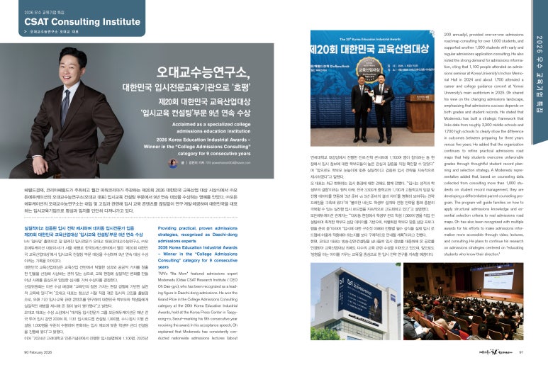 TVN’s “Ilta Mom” featured admissions expert Modenedu (Odae CSAT Research Institute / CEO Oh Dae-gyo), who has been recognized as a leading figure in Daechi-dong admissions. He won the Grand Prize in the College Admissions Consulting category at the 20th Korea Education Industrial Awards, held at the Korea Press Center in Taepyeong-ro, Seoul—marking his 9th consecutive year receiving the award. In his acceptance speech, Oh explained that Modenedu has consistently conducted nationwide admissions lectures (about 200 annually), provided one-on-one admissions road map consulting for over 1,000 students, and supported another 1,000 students with early and regular admissions application consulting. He also noted the strong demand for admissions information, citing that 1,100 people attended an admissions seminar at Korea University’s Inchon Memorial Hall in 2024 and about 1,700 attended a career and college guidance concert at Yonsei University’s main auditorium in 2025. Oh shared his view on the changing admissions landscape, emphasizing that admissions success depends on both grades and student records. He stated that Modenedu has built a strategic framework that links data from roughly 3,300 middle schools and 1,700 high schools to clearly show the difference in outcomes between preparing for three years versus five years. He added that the organization continues to refine practical admissions road maps that help students overcome unfavorable grades through thoughtful student record planning and selection strategy.