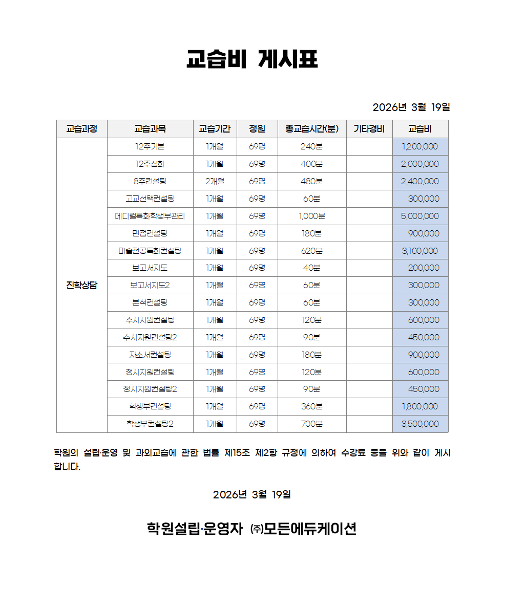 교습비 게시표